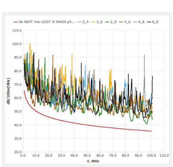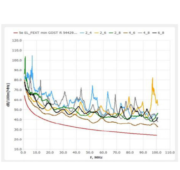 Защищенность на дальнем конце образца СКС-кабеля TechnoLAN соответствует 5e-требованиям